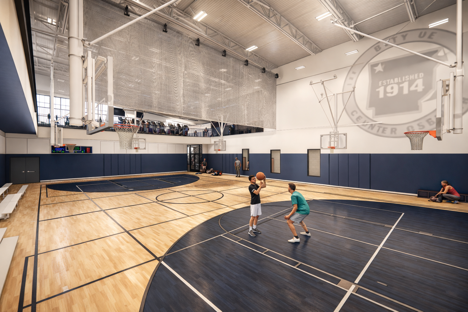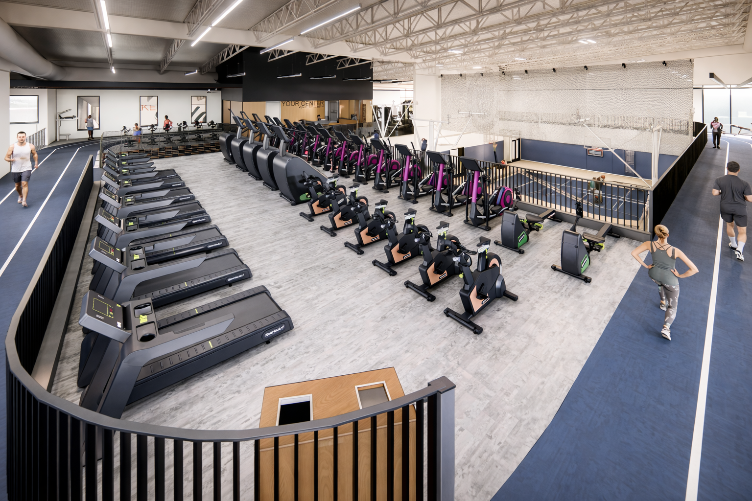 The facility features a full aquatics area with a swimming pool, dedicated party rooms for celebrations and gatherings, a child watch room to support busy parents, and a flexible community room for programs and events. Additional amenities include locker rooms, administrative offices, a gymnasium, and an exercise studio for group fitness classes. On the second level, an open-air indoor walking track provides elevated views into the gym below and connects seamlessly to cardio and weight training zones—creating an inviting, dynamic environment for users to meet their fitness goals.
